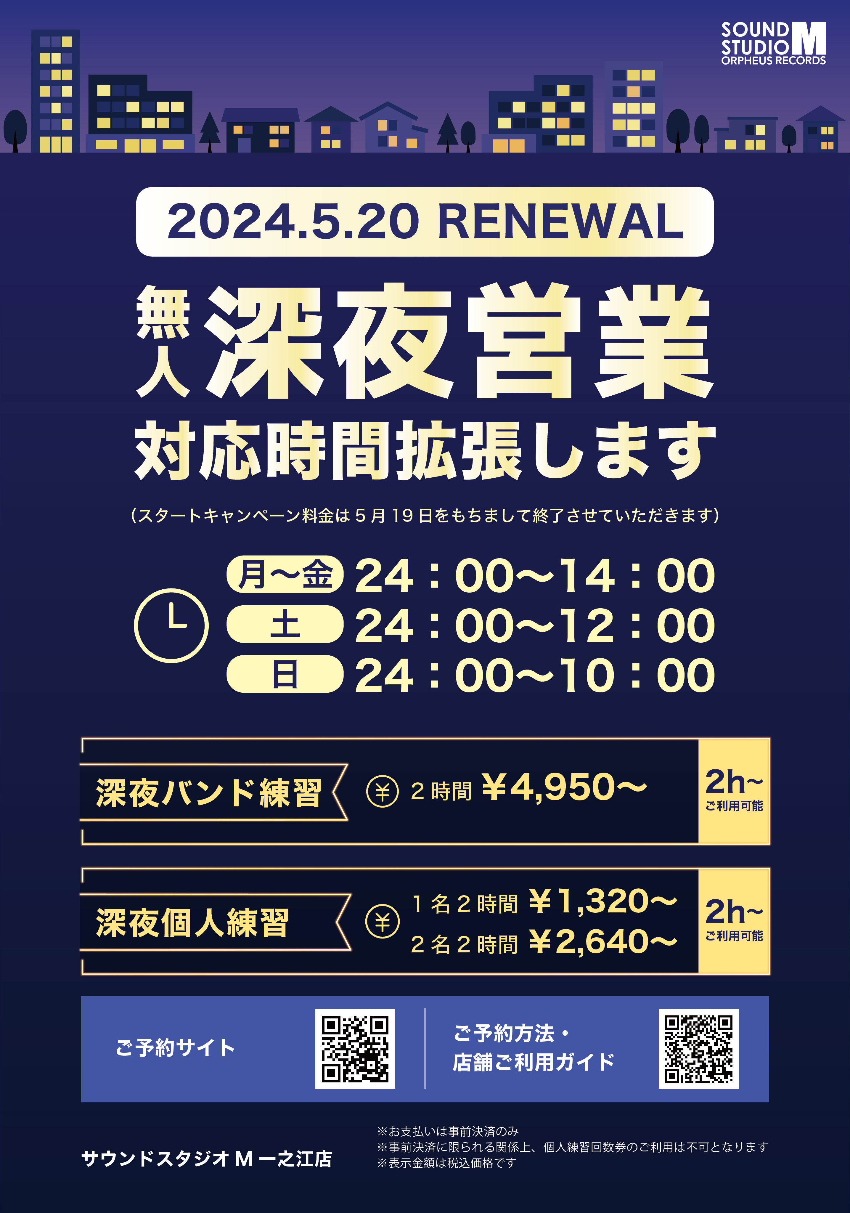 SOUND STUDIO M 小岩 無人営業時間帯のご案内