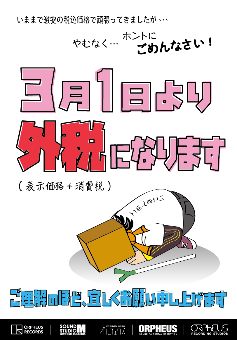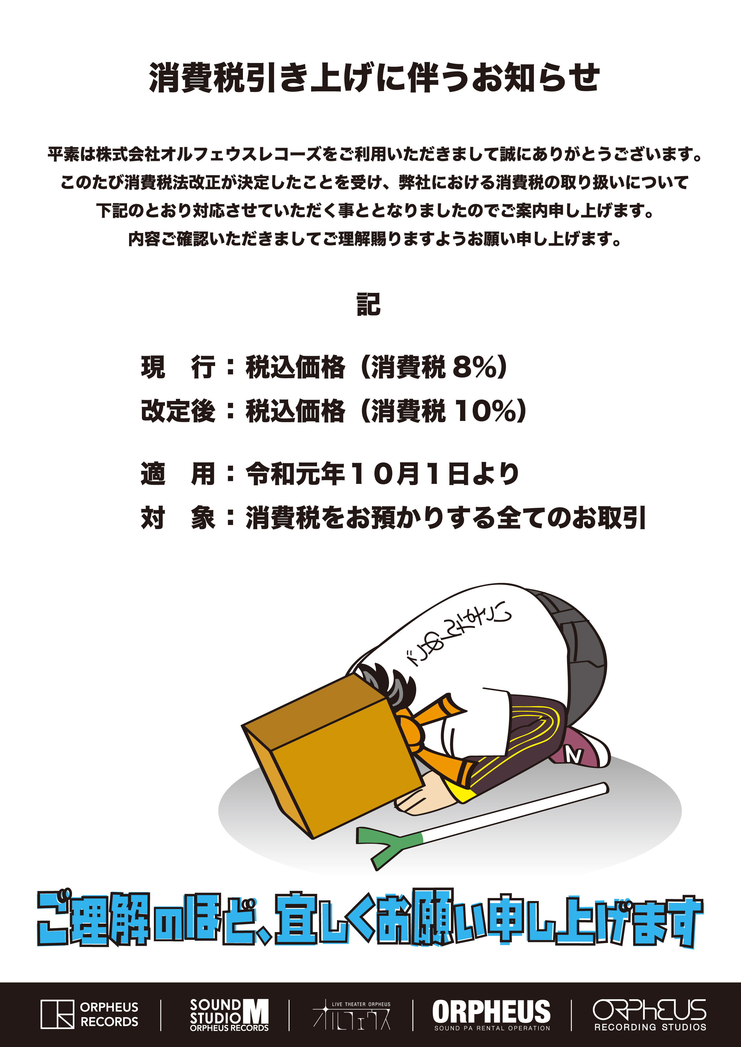 平素は株式会社オルフェウスレコーズをご利用いただきまして誠にありがとうございます。この度の消費税法改正に伴いまして、 弊社における消費税の取り扱いにつきましては令和元年10月1日より消費税10%にての対応とさせていただきます。ご理解賜りますようお願い申し上げます。 - 2019-03-01