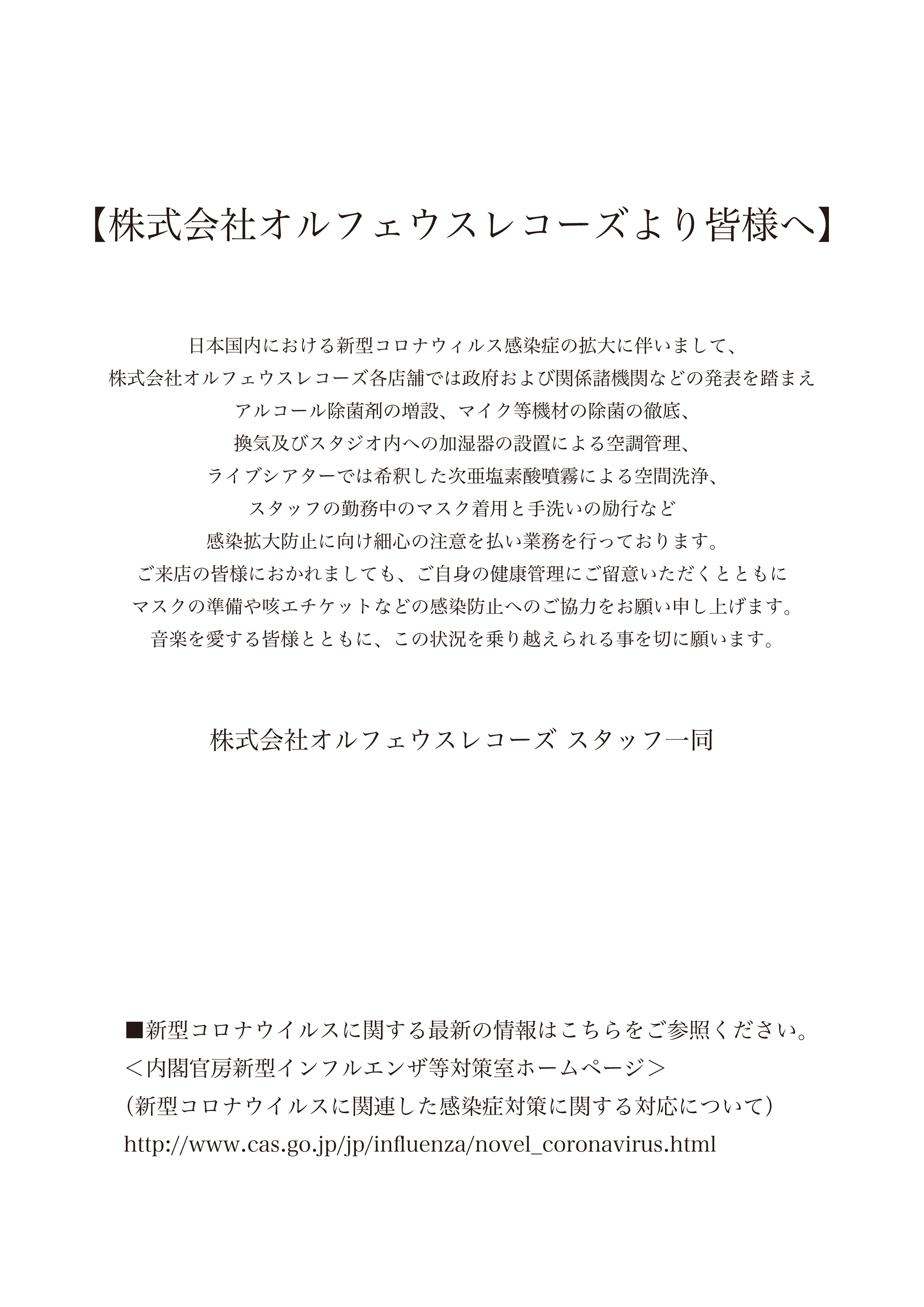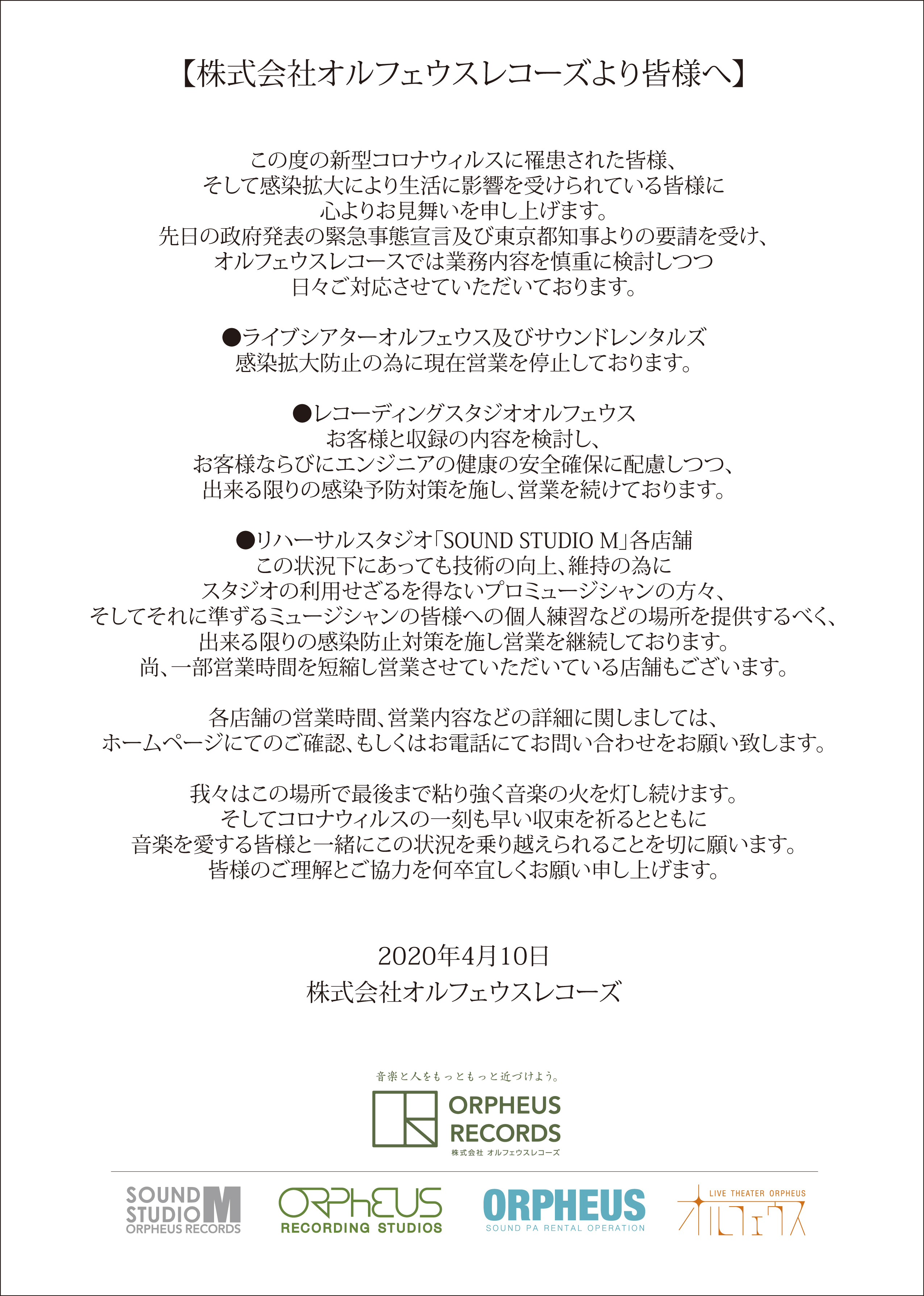 日本国内における新型コロナウィルス感染症の拡大に伴いまして、株式会社オルフェウスレコーズ各店舗では政府および関係諸機関などの発表を踏まえ、アルコール除菌剤の増設、マイク等機材の除菌の徹底、換気及びスタジオ内への加湿器の設置による空調管理、ライブシアターでは希釈した次亜塩素酸噴霧による空間洗浄、スタッフの勤務中のマスク着用と手洗いの励行など感染拡大防止に向け細心の注意を払い業務を行っております。
