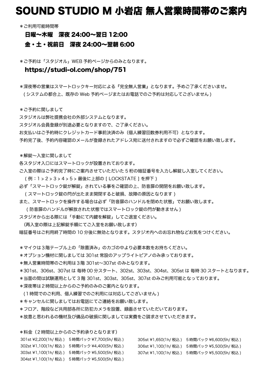 SOUND STUDIO M 小岩 無人営業時間帯のご案内